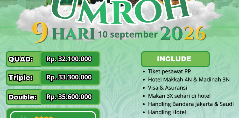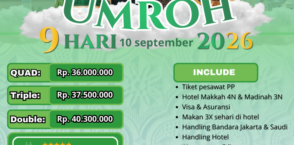 Program Umroh 9 Hari ini dirancang buat jamaah yang pengen ibadah dengan nyaman, fasilitas lengkap, dan pelayanan maksimal. Keberangkatan dijadwalkan pada 10 September 2026, menggunakan...
